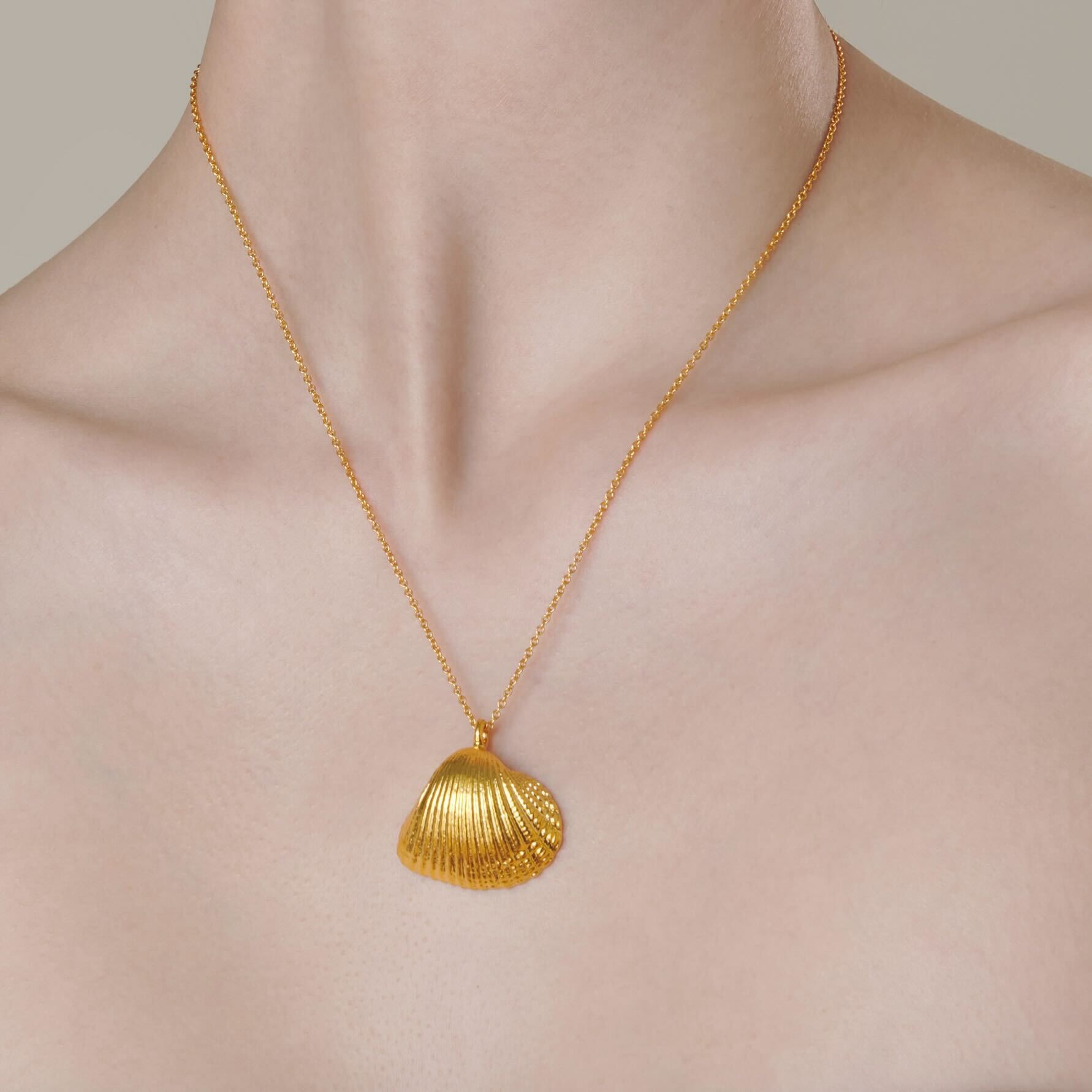 A sculptural tribute to the sea’s quiet treasures. Cast in 24k gold, the Clam Pendant captures the graceful curves and ridged texture of a naturally closed shell.