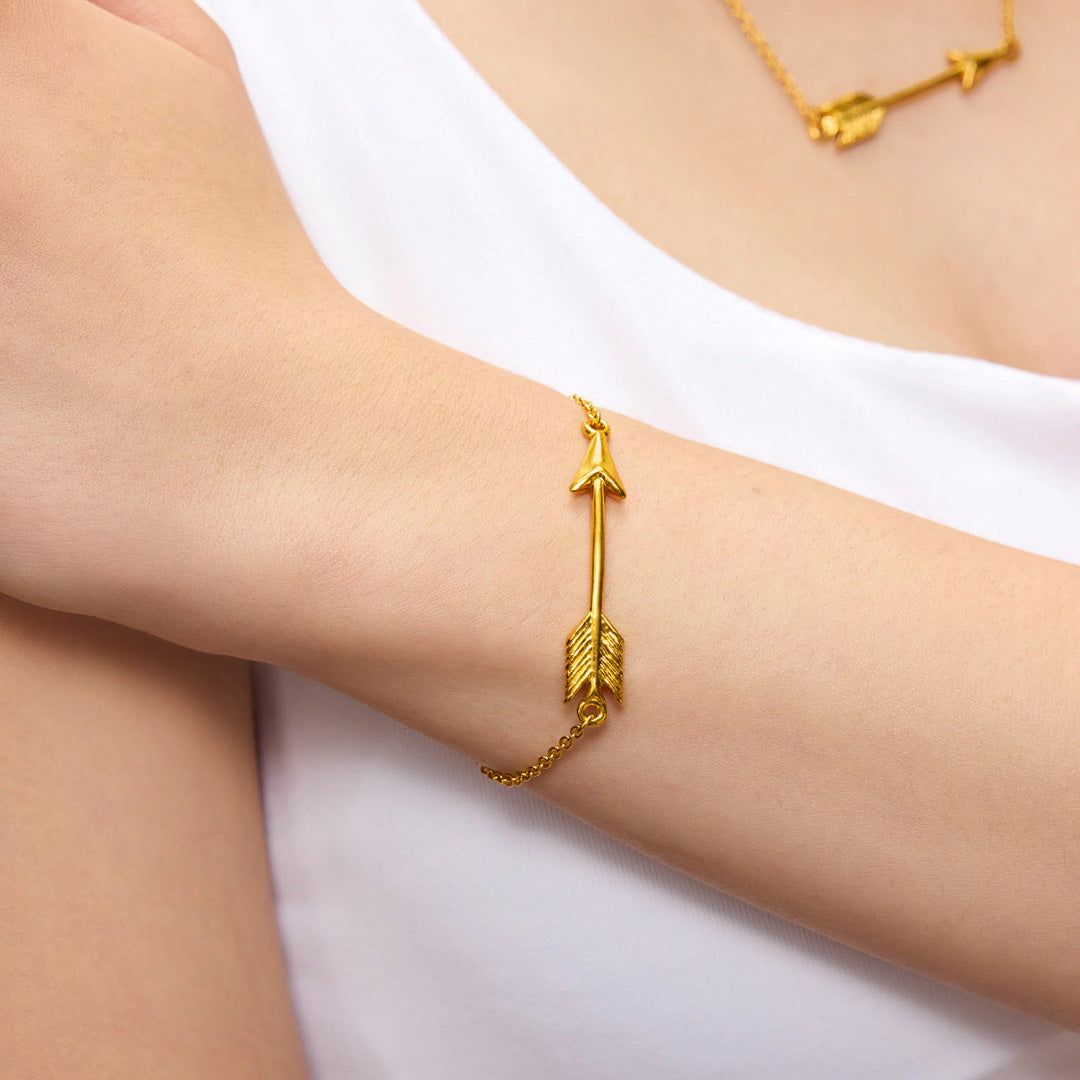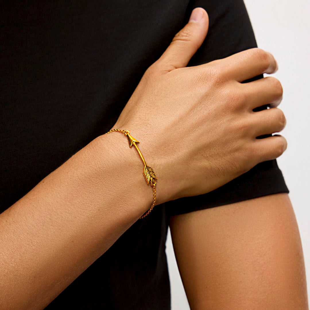 A golden thread of meaning. The Cupid Arrow Bracelet in 24k gold wraps the wrist in warmth and symbolism, a subtle reminder of love’s direction and resolve.