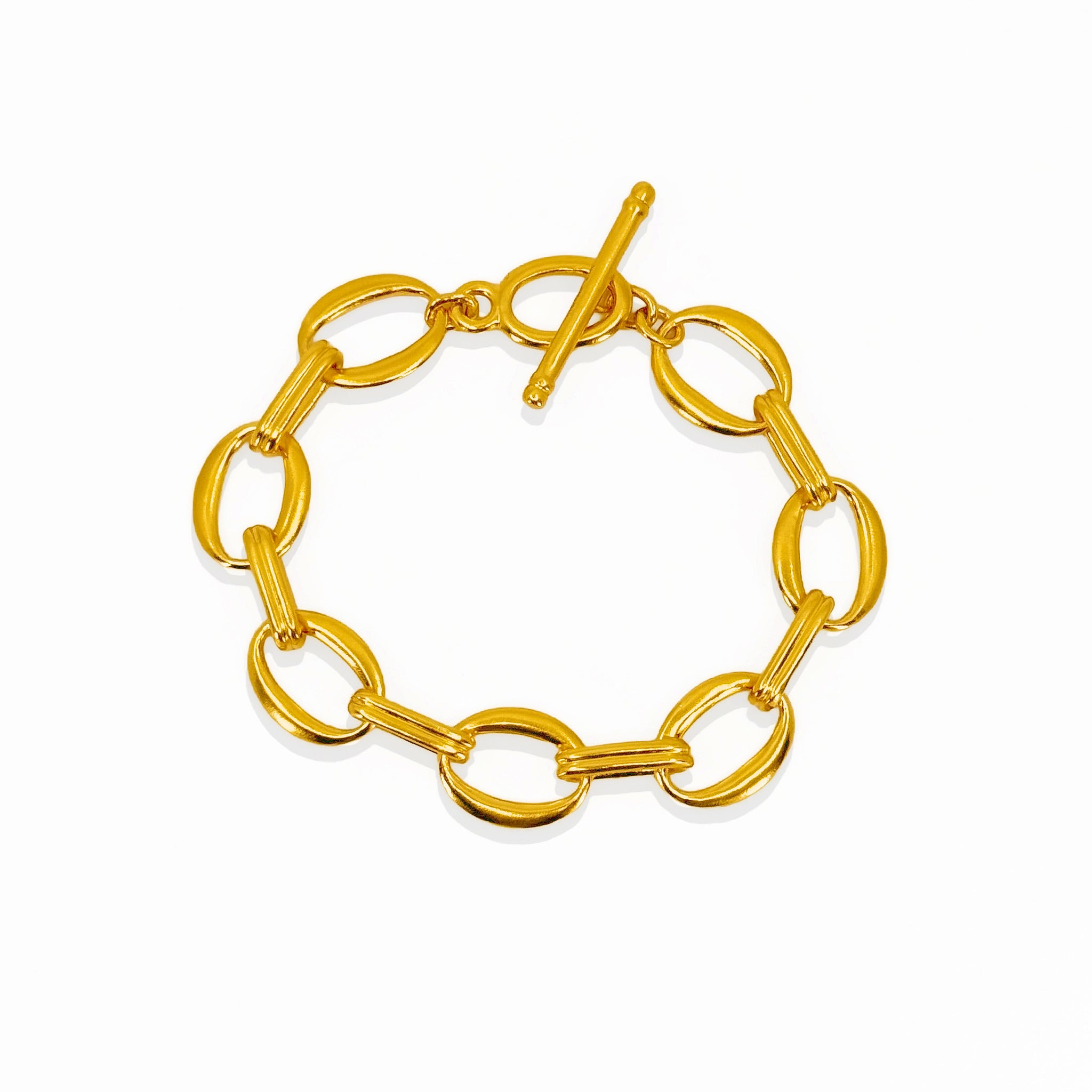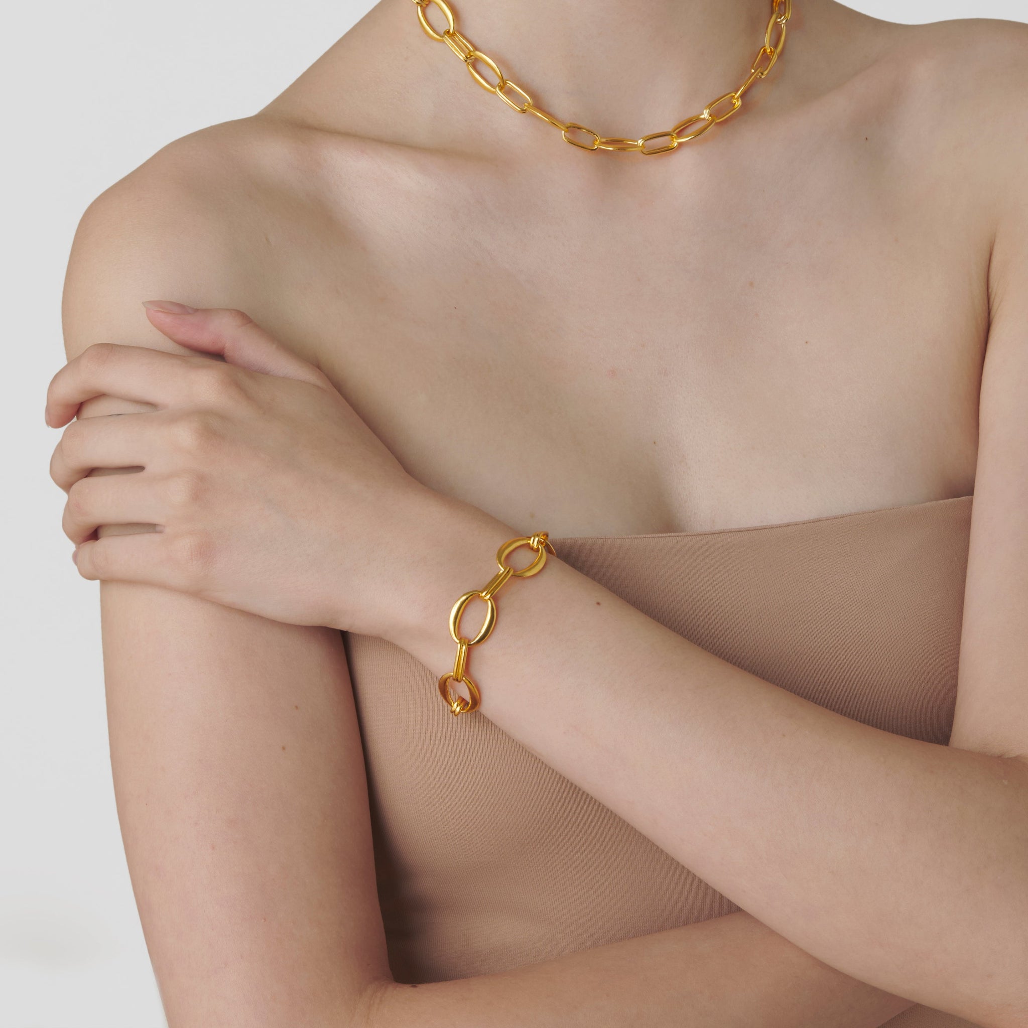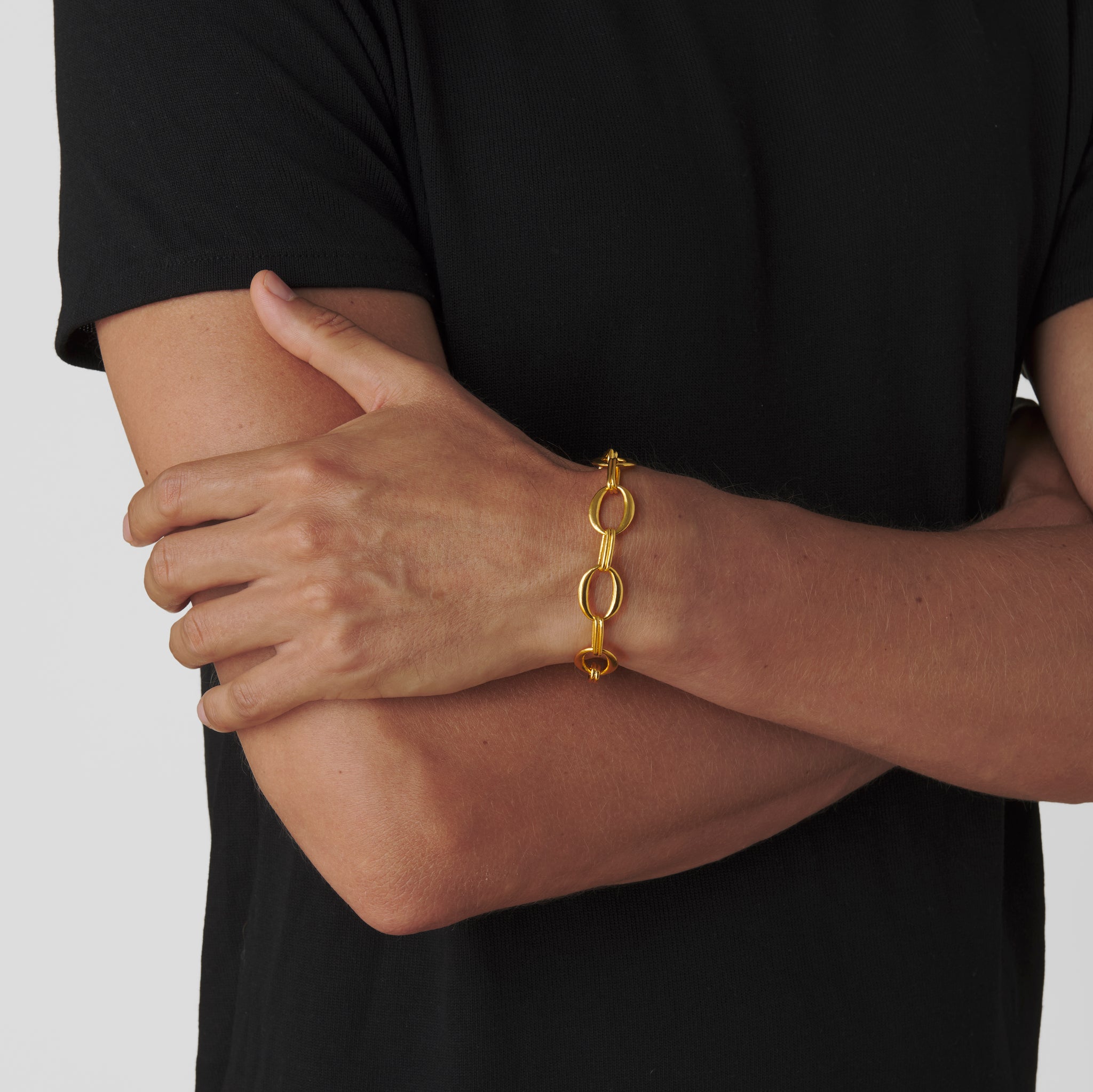 Interlocking strands of 24k gold, the Double Link Bracelet wraps the wrist in a continuous flow of strength, elegance, and permanence.